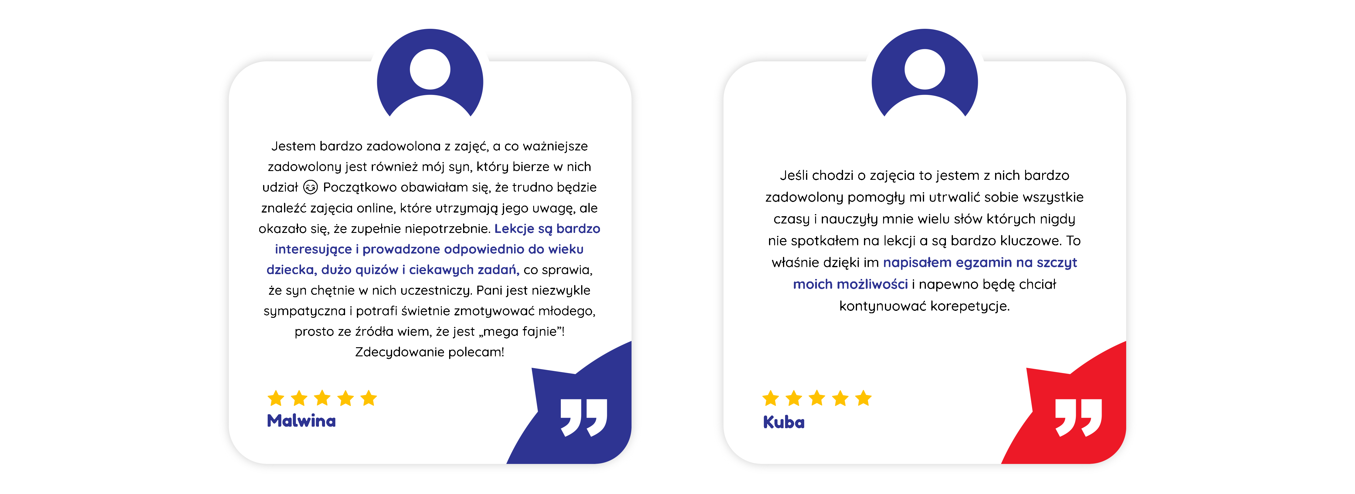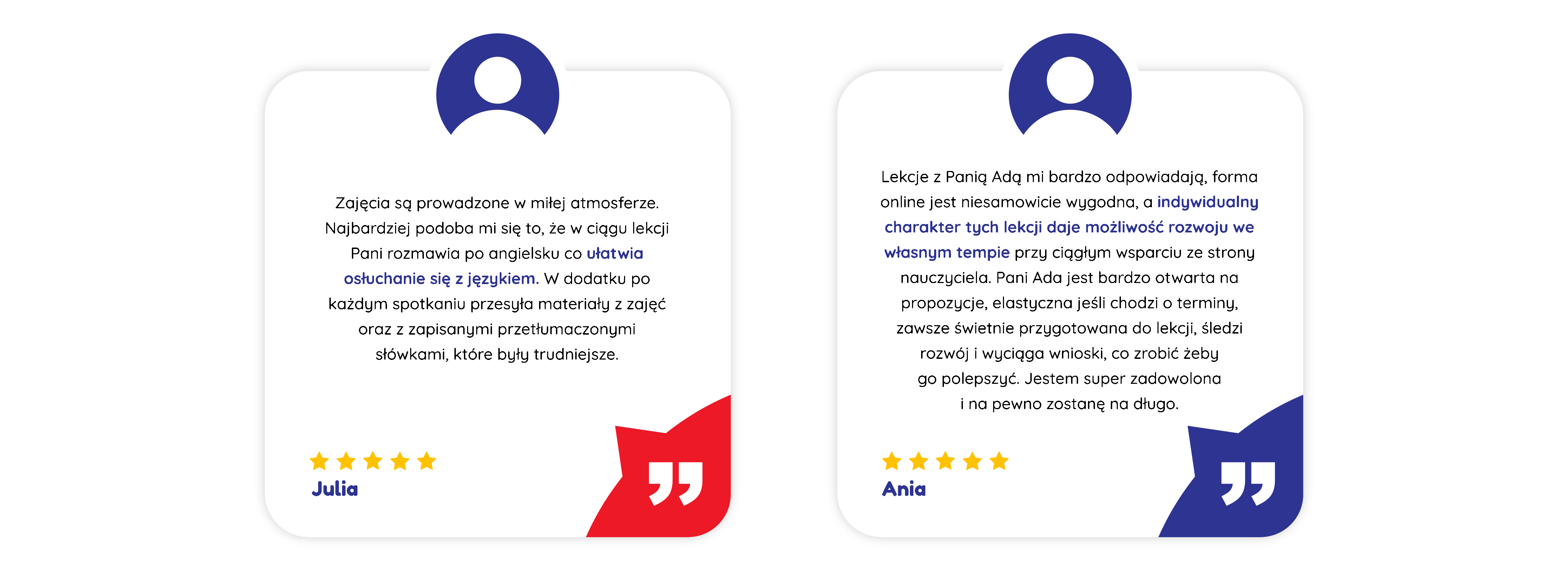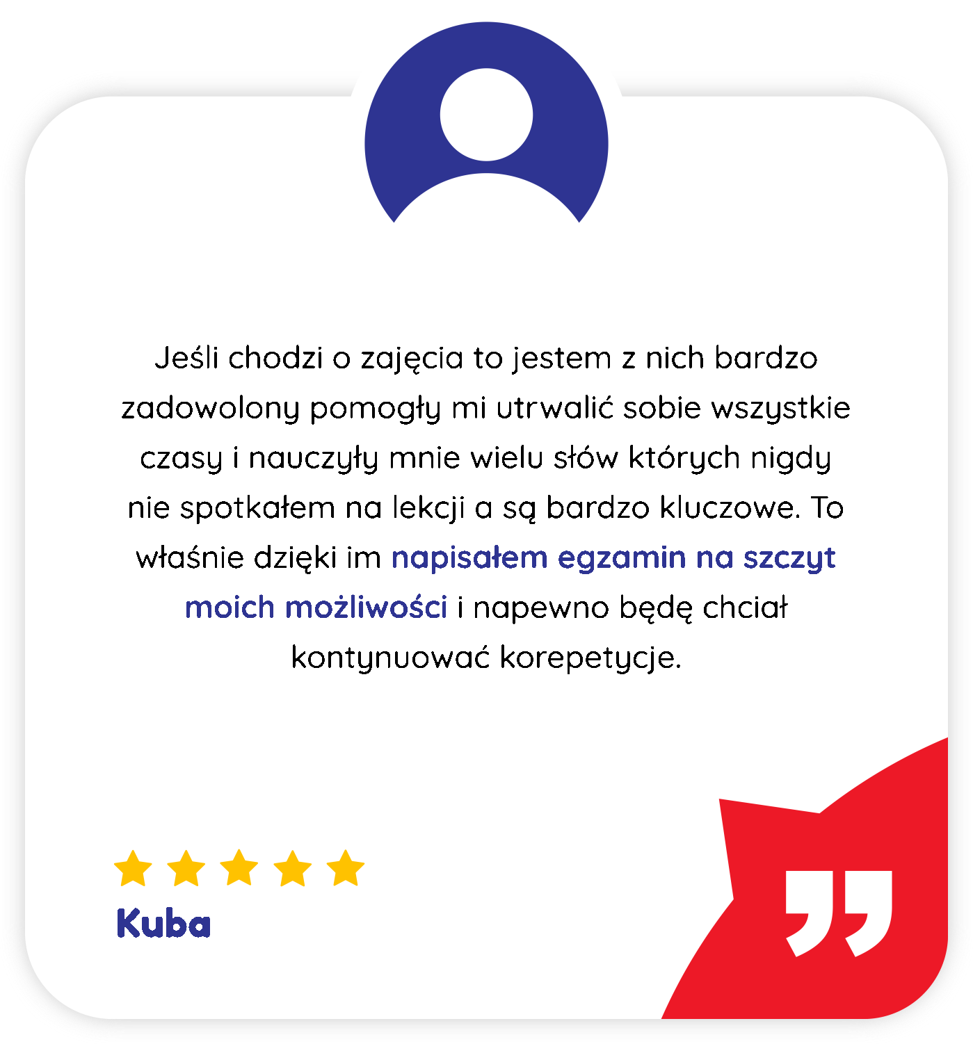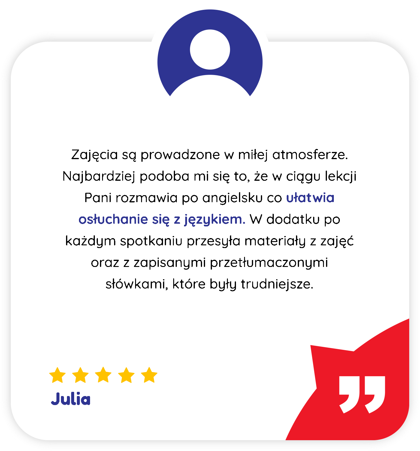 Wsparcie w nauce języka na bieżąco, przyjazna atmosfera i nauka bez stresu.